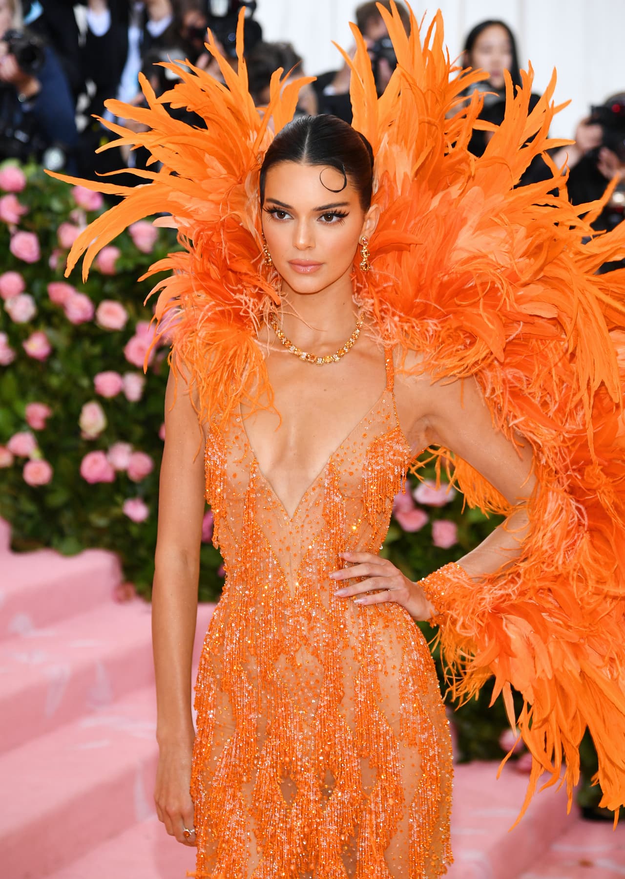 Kendall Jenner lució un vestido largo naranja brillante, imposible de ignorar. Bueno, pero más discreto en comparación con las plumas que salían de su hombro derecho y llegaban hasta su brazo izquierdo.