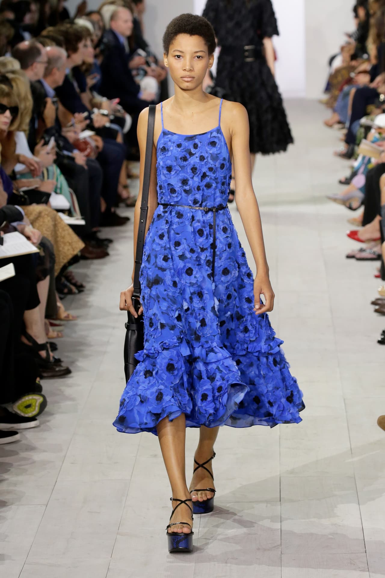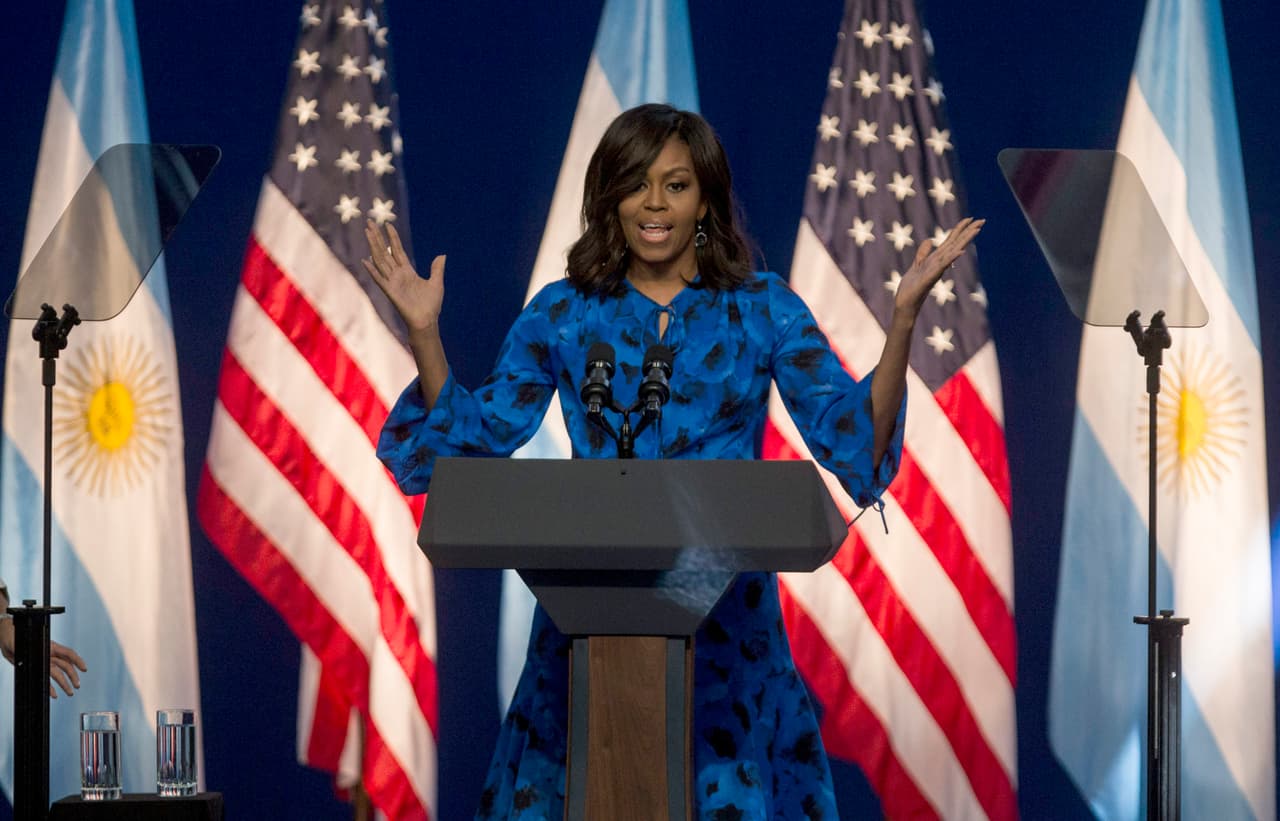 Con un estilo que privilegia los vestidos muy lady like, es decir, de corte en la cintura y faldas de vuelo amplio, Michelle Obama eligió un vestido azul de print botánico en color azul de la colección primavera 2016 de Michael Kors. Una manera de homenajear a los argentinos siempre tan identificados con el tono de su bandera.