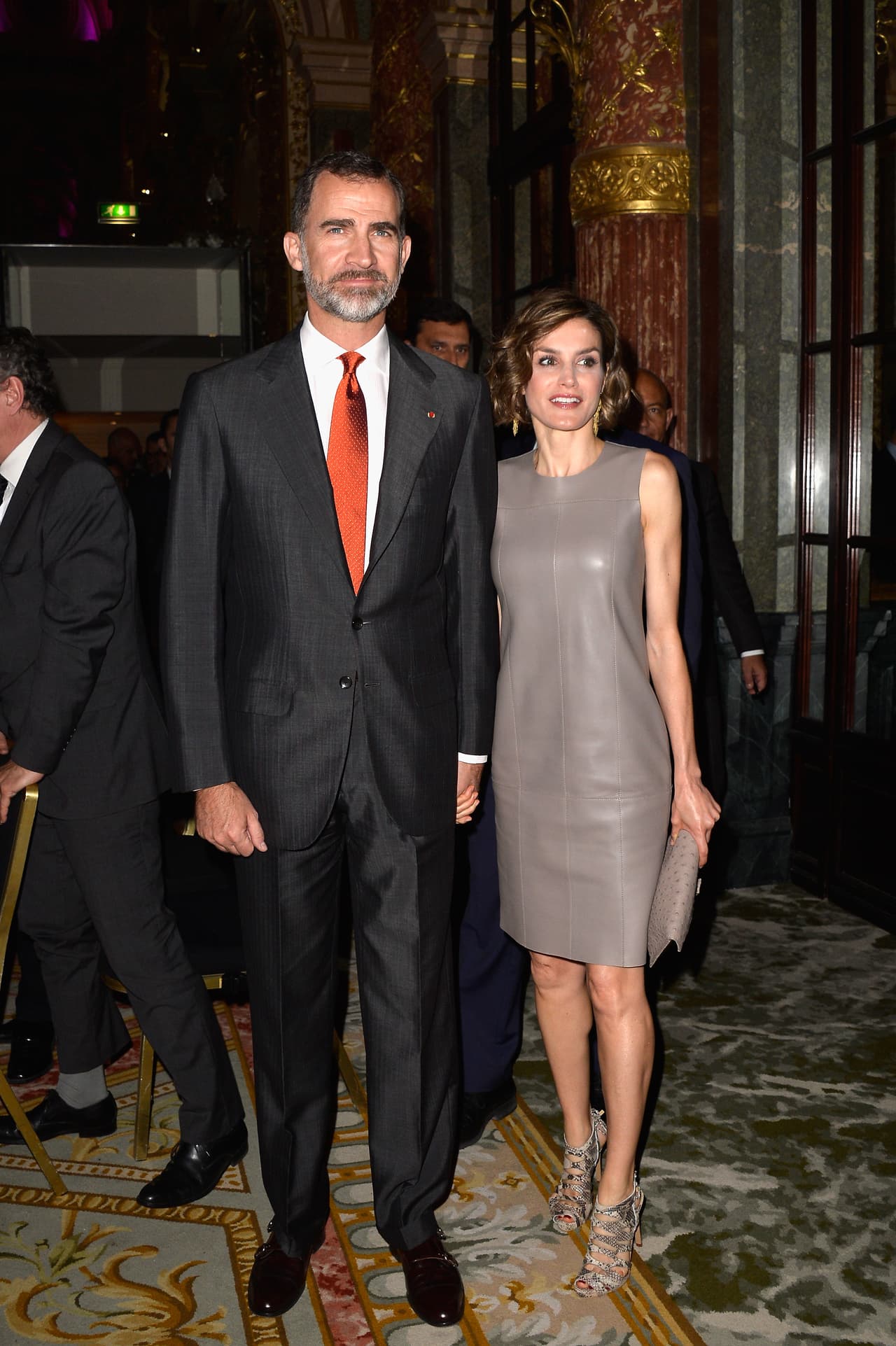 Letizia tiene un amor especial a los vestidos de cuero, los cuales abrazan su esbelta silueta de manera espectacular como este increíble modelo corto y sin manga.