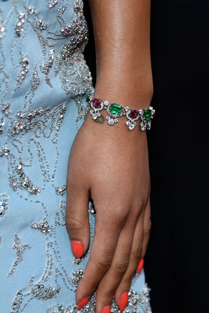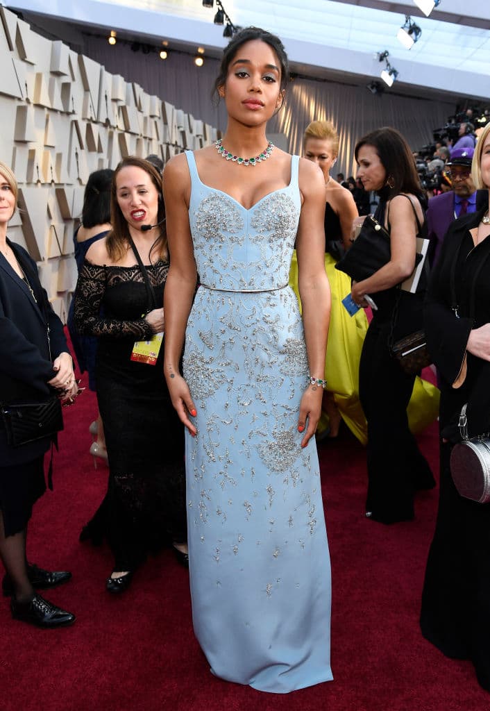 Por la película BlacKkKlansman, Harrier asistió por primera vez en la alfombra roja de los Óscar y tiene detalles espectaculares: seda crepé azul certificada por Global Organic Textile Standards, bordado con cuentas de vidrio, cristal de Swarovski, lentejuelas y más de 450 horas de trabajo. Además, la celebridad acompañó el look con joyas de platino, diamantes, rubelitas y esmeraldas.