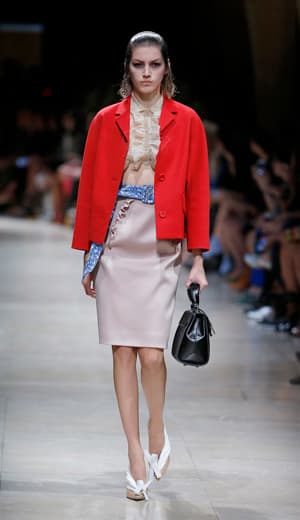 La italiana Miuccia Bianchi Prada elaboró una colección de tonalidades pasteles llena de romanticismo juvenil, donde los vestidos y las blusas sumamente femeninas junto con abrigos para primavera destacaron en una pasarela engalanada con una hermosa alfombra azul.
