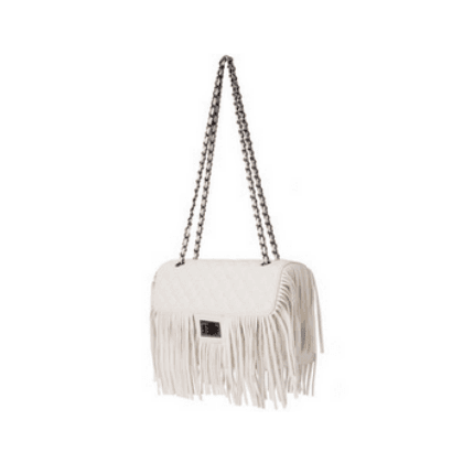 La clave es combinar tus jeans de tiro alto con una camisa de seda color vino, agrega un collar plateado con detalles en negro, unas originales botas animal print en blanco y negro que le den un toque audaz y un bolso blanco con flecos para darle un toque trendy.