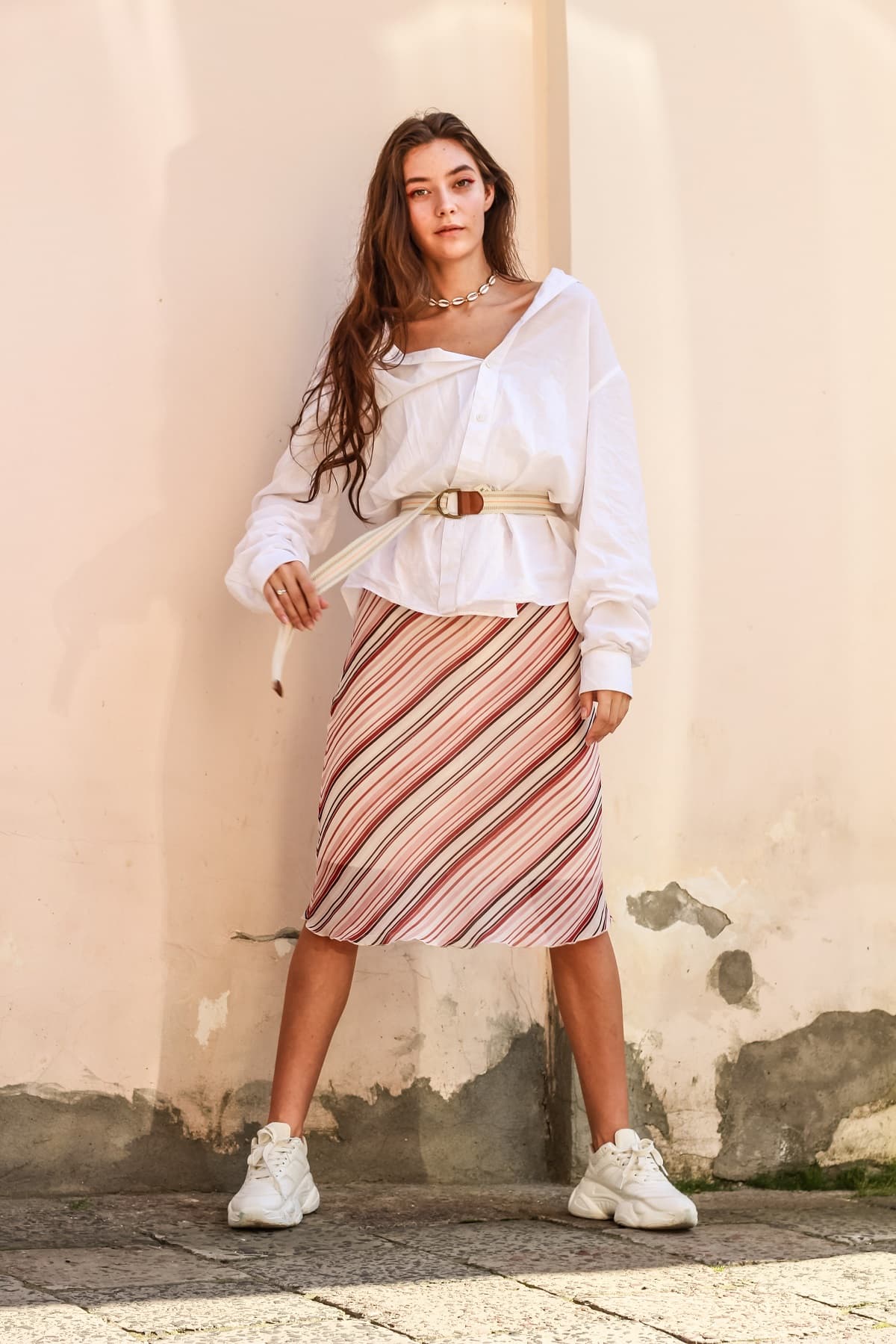 Combina el blanco con una falda en tonos pastel como el rosa y agrega una bolsa en un rojo para darle un toque vibrante.