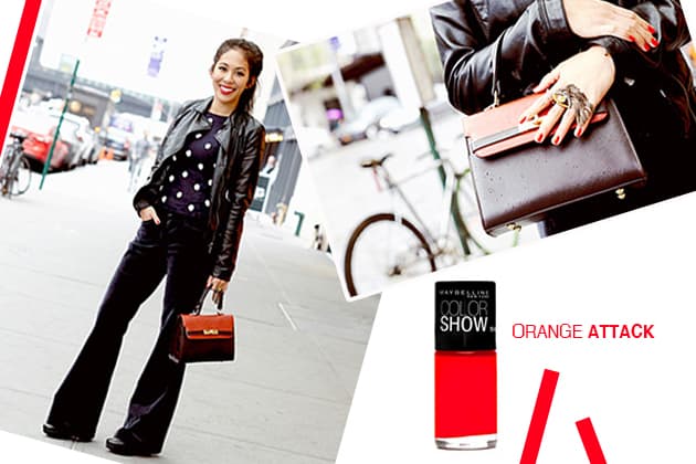 Un look rockero, vibrante y muy canchero que se complementa con este tono de Maybelline ColorShow. El naranja está de moda.