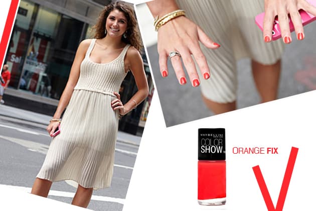 Vestido color natural plisado y uñas naranjas logran un look perfecto. El color naranja se impone este año, si te gusta también el rojo, el tono Orange Fix es ideal porque mezcla estos dos colores.