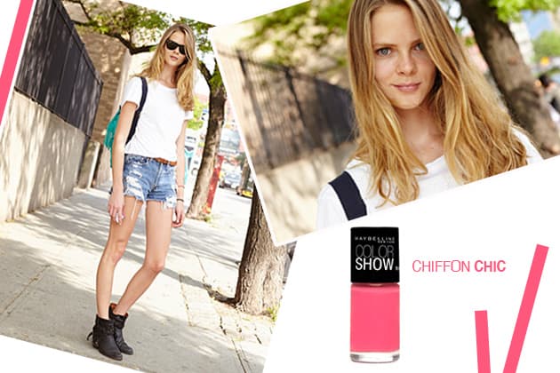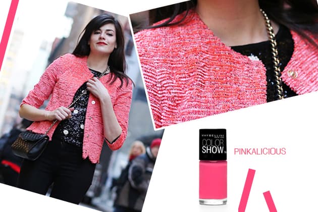 Este tono es como el rosa chicle de la colección. En este caso la elección es un look en total black y un accesorio de color vibrante a tono con el esmalte.