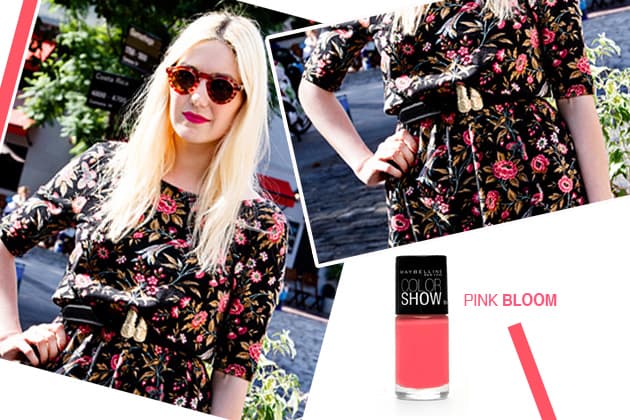 Este rosa si que nunca va a pasar de moda. Como en el look anterior, se combina el esmalte con un pequeño detalle del estampado del vestido. Flores rosas, cinturón divino en dorado y esmalte Pink Bloom.