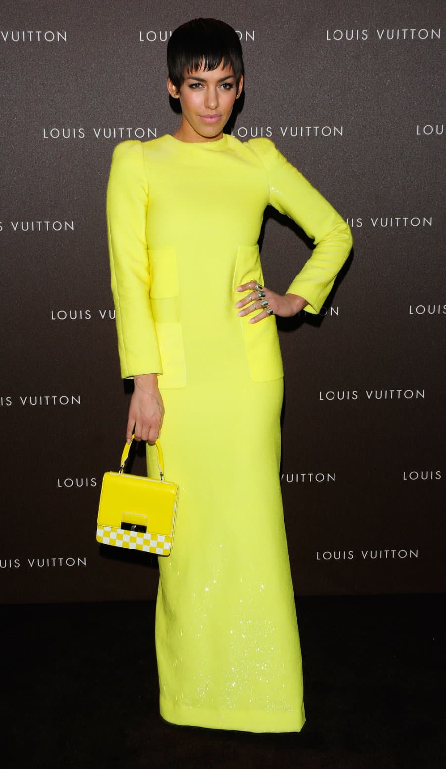 El amarillo neón es el color de estas temporadas. Y la cantante Alina Sü ggeler lo lució en un vestido largo y con mangas, muy moderno con detalle en brillos, hombreras y bolsillos.