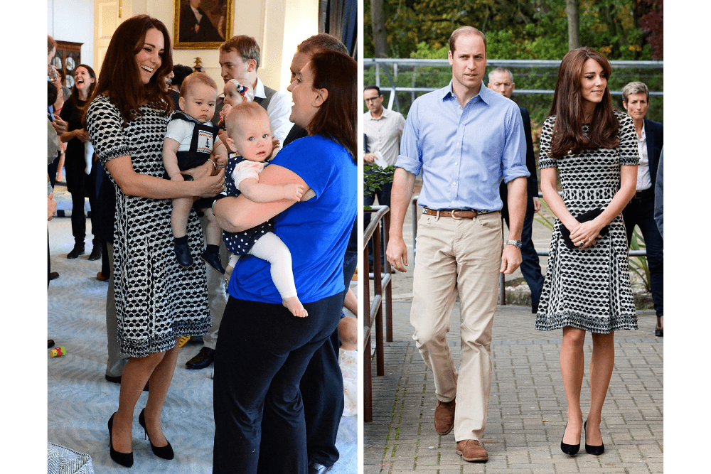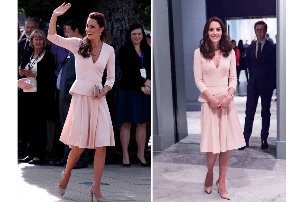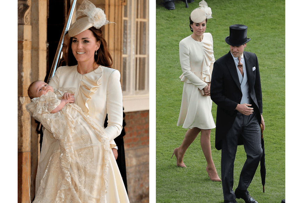 Kate usó el mismo vestido en un tono crema, de uno de sus diseñadores favoritos, Alexander McQueen, en dos ocasiones especiales. La primera, el bautizo de su primer hijo, George, en 2013; la segunda, en 2016, en una fiesta de la reina.