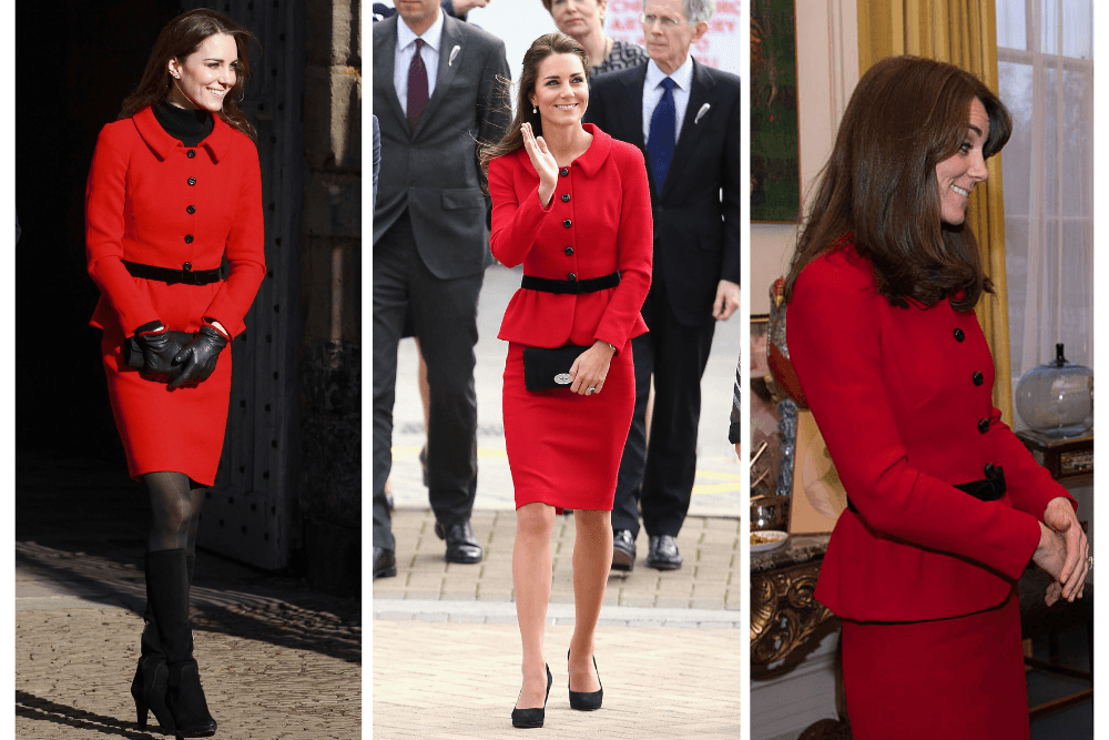 El rojo parece ser uno de los colores favoritos de la duquesa. Este conjunto de Luisa Spagnoli visitó con Kate, en febrero de 2011, el alma máter de la duquesa y del príncipe William, para un evento que tuvo lugar dos meses antes de su boda. En el tour por Oceanía de 2014, la duquesa utilizó el mismo conjunto, en el que incluso hasta jugó al críquet. Y por si todo esto fuera poco, el traje volvió a ver la luz una tercera vez en 2015.