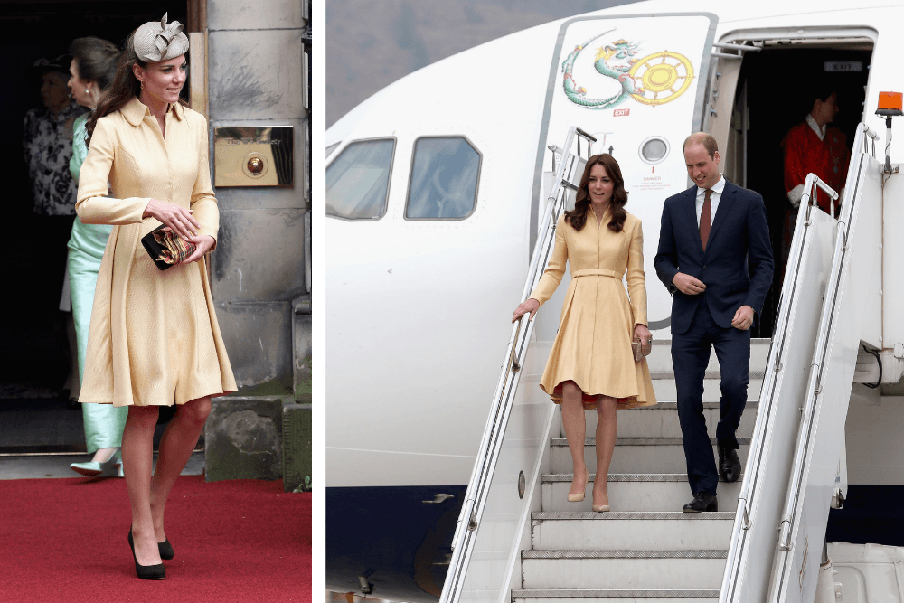 El 5 de julio de 2012, el príncipe Guillermo se unió a la Orden del Cardo, la más honorable orden de caballería dentro de la realeza británica. Para la ocasión, Kate llevó un vestido abotonado por delante, de Emilia Wickstead. En ese momento lo combinó con unos tacones color café, pero, cuatro años después, para su visita a Timbu, la capital y ciudad más grande de Bután, usó accesorios en nude. ¿Qué color queda mejor?