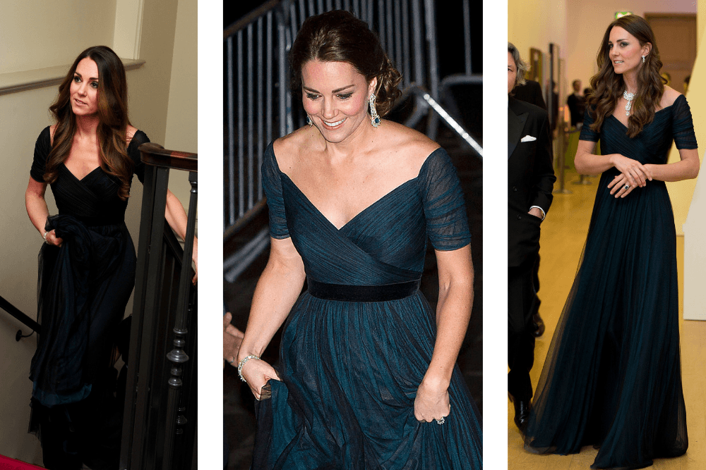 Este vestido ha sido visto por lo menos tres veces por las cámaras: la primera fue en una cena de gala en 2013, la segunda, para la edición 2014 de la Portrait Gala, y la tercera, para la cena de aniversario de los 600 años de la Universidad de St. Andrews, alma máter de Kate y Guillermo. Y este no es el único vestido diseñado por Jenny Packham que la duquesa ha reutilizado.