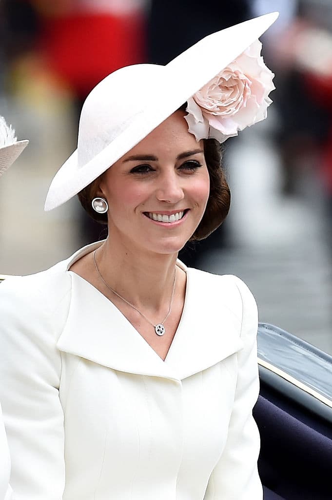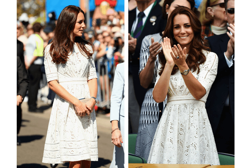 Kate ha usado este vestido blanco en repetidas ocasiones: dos ejemplos claros son el desfile «Trooping the color» en 2016 y el bautismo de la princesa Charlotte en 2015. También fue su elección para el centenario de la batalla de Passchendaele en Bélgica.