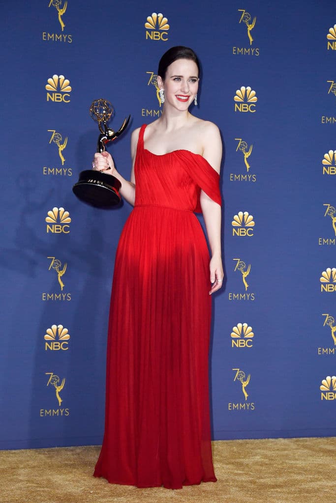 Para la red carpet de los Emmys, Rachel Brosnahan se convenció por llevar un hombro libre y un escote de corazón. El rojo intenso destaca su cabello y ojos.