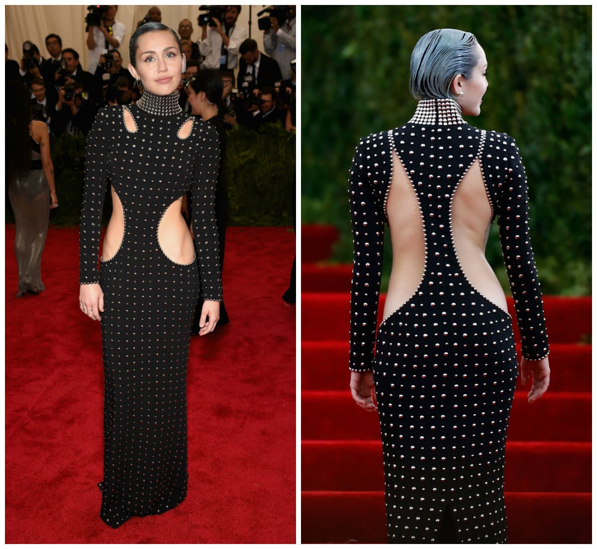 La cantante Miley Cyrus lució un vestido largo negro de Alexander Wang con detalles en metalizado.