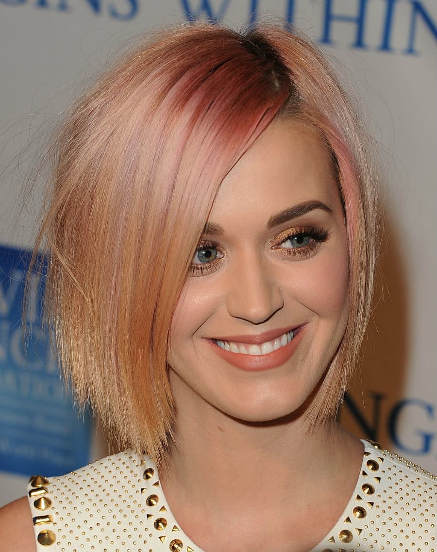 En 2012 Katy asistió a los Much Music Video Awards luciendo una cabellera larga con flequillo recto y corto, y el detalle de las mechas en tonos de azul.