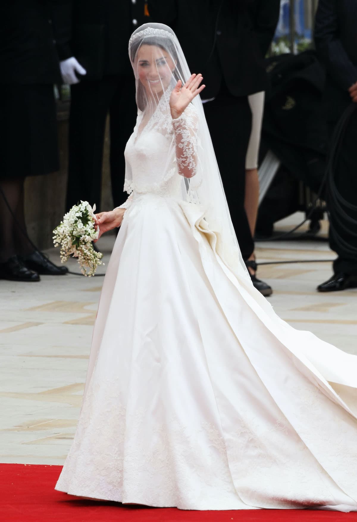La exclusiva prenda fue una colaboración con Sarah Burton de Alexander McQueen, quien agregó un corpiño estilo victoriano y una cola de casi tres metros.