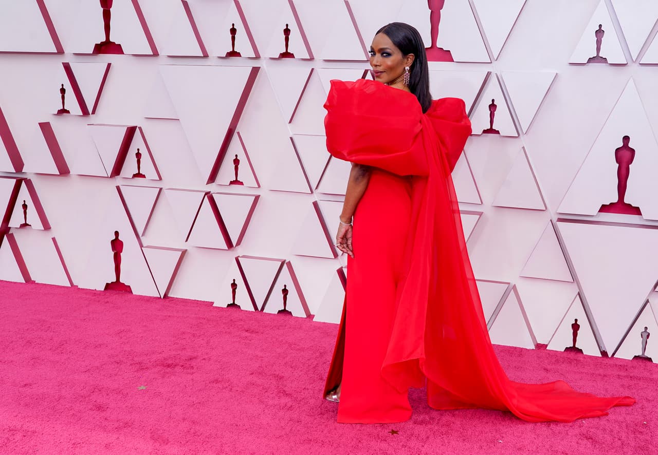 Angela Basset optó por un hermoso vestido rojo Alberta Ferretti que de frente presume una sensual abertura en la pierna y unas mangas amponas que nos recuerdan a un moño.