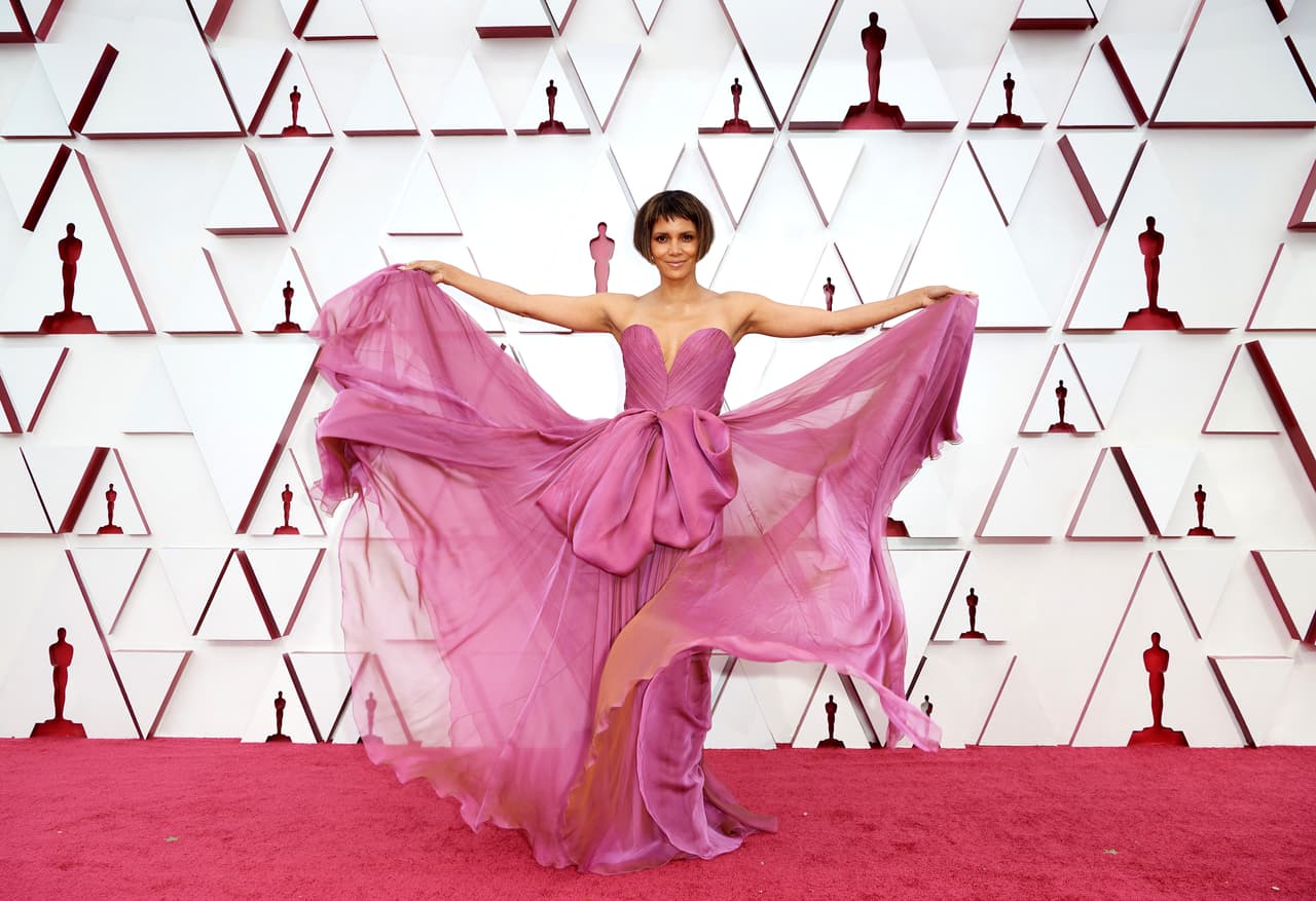 El vestido de Halle Berry podría ser como un atuendo tradicional y vaporoso, no obstante, el enorme moño en la parte de enfrente le da un gran toque de originalidad y extravagancia.