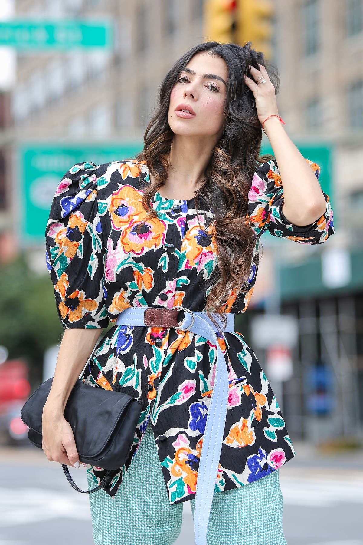 Atrévete a combinar una gran blusa con flores de colores y para la parte inferior agrega unos pantalones con estampado de pata de gallo. Te verás con mucho estilo.