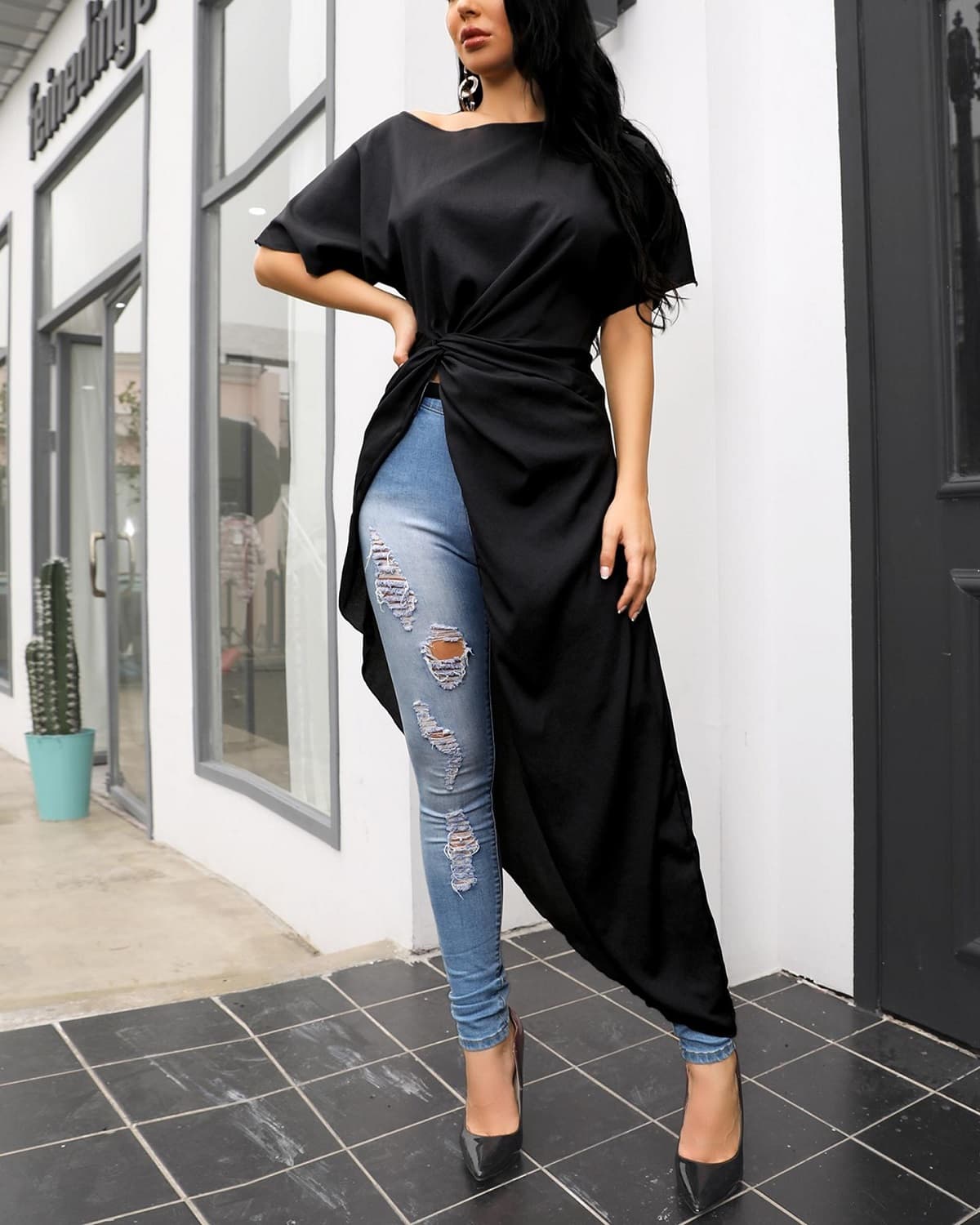 El negro siempre será el rey de los colores clásicos y elegantes. Apuesta por él en una blusa larga y combínala con unos zapatos de punta o unos stilettos.
