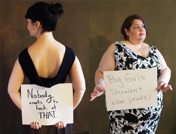 Con un gran impacto visual, las mujeres sostienen los carteles con las frases que alguna vez han tenido que escuchar como “Esconde tus brazos. Son un problema” o “Eres demasiado ancha para llevar brillos”, entre otras.