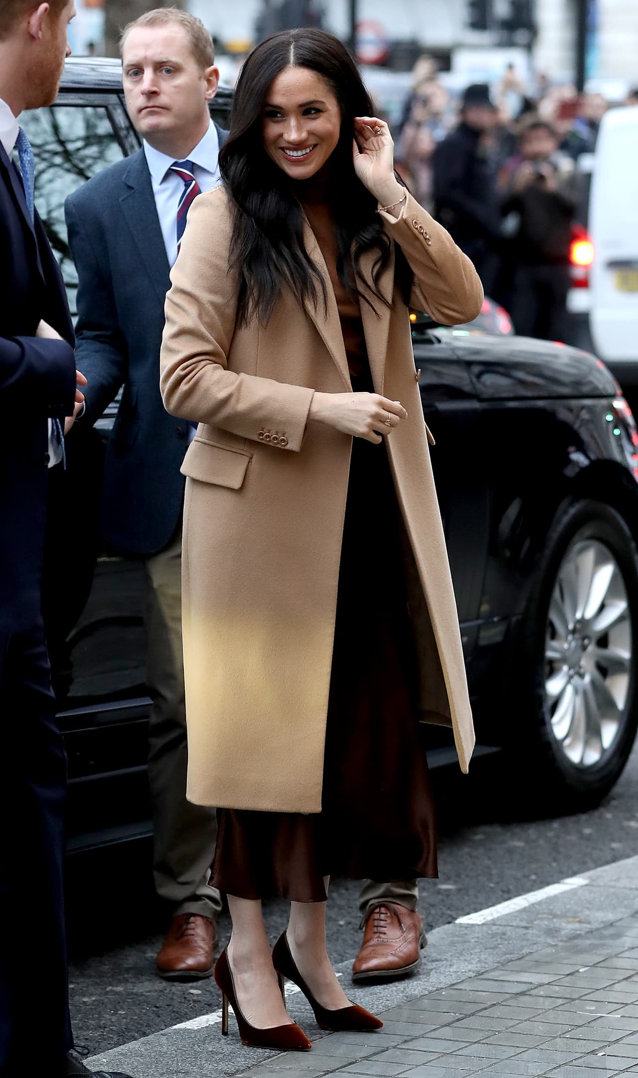 Meghan decidió que lo de hoy es el monocolor, por lo que lució un suéter ligero de cuello alto con una falda midi satinada, ambas en diferentes tonos de café y acompañadas de un abrigo color arena.