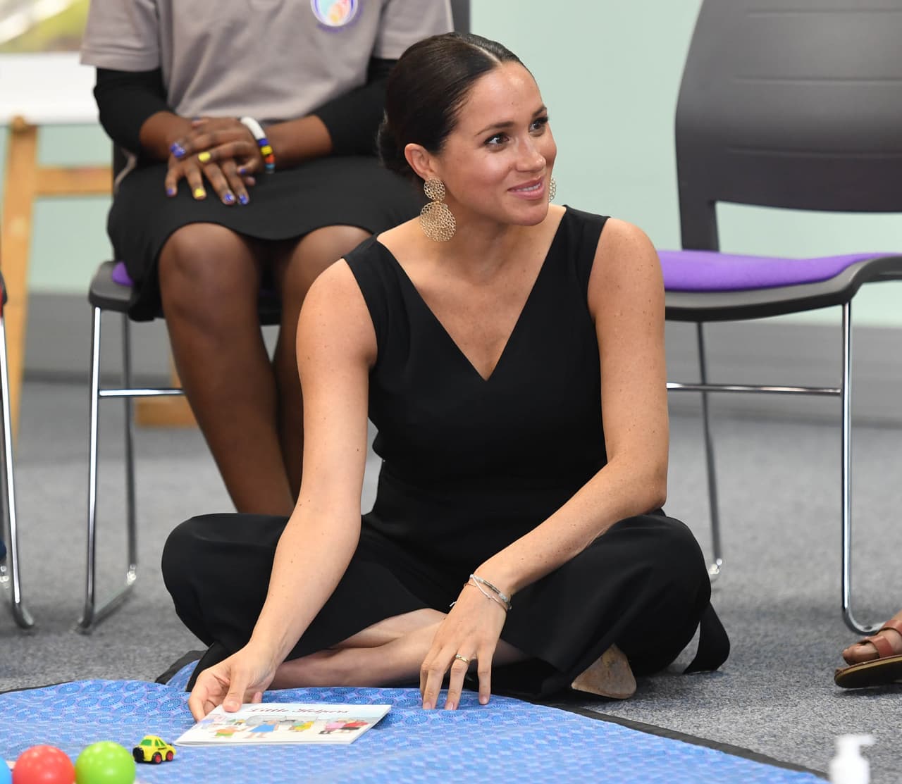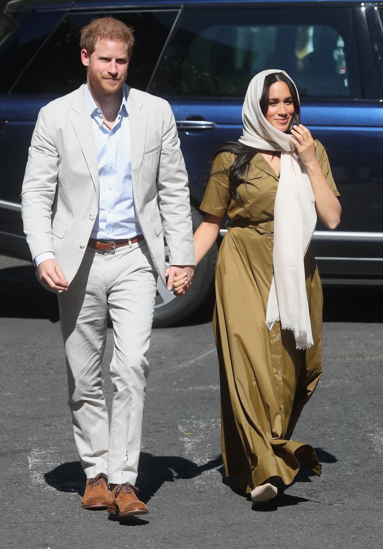En su segunda aparición en público, Meghan eligió un sencillo vestido en color oliva con textura satinada. Con lo mínimo de joyería, cubrió su cabeza con un modesto pañuelo y calzó unos zapatos bajos sin tacón.