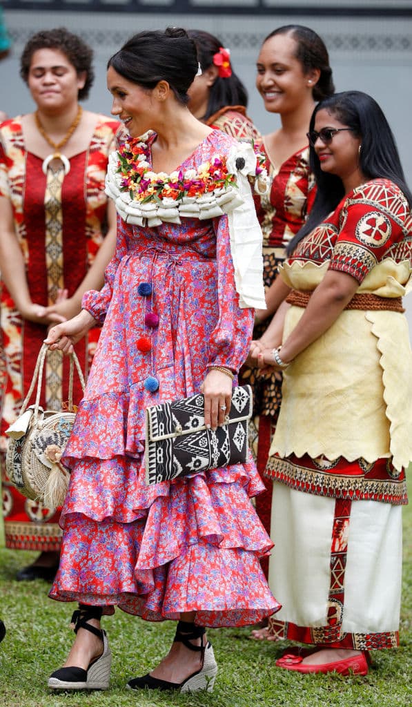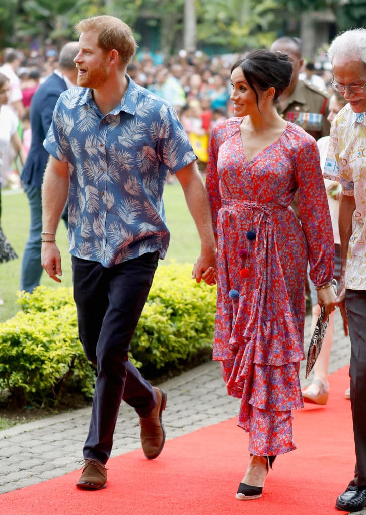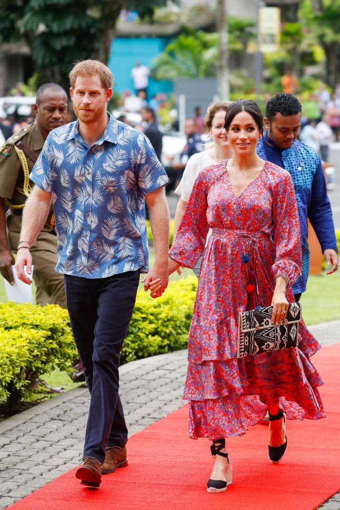 Los duques de Sussex siguen en la gira por el Pacífico. Esta vez fue el turno de Fiji, en donde Harry y Meghan lucieron tan veraniegos como enamorados. Meghan decidió lucir su gran pancita con un vestido colorido y con pompones de Figue que cuesta 1495 dólares (y está agotado). Los volados, el cinturón, los colores y su corte potenciaron la figura y la pancita de la duquesa.