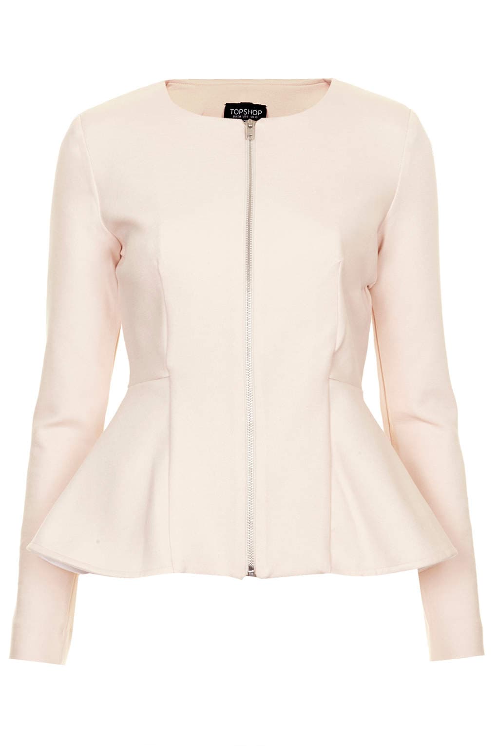 Si buscas un color llamativo, clásico y fácil de combinar, el blanco es tu mejor opción. Combina una chaqueta peplum blanca como esta de Topshop con una blusa de flores y unos skinny jeans, añade unos zapatos de tacón nude y tendrás un look casual fabuloso.