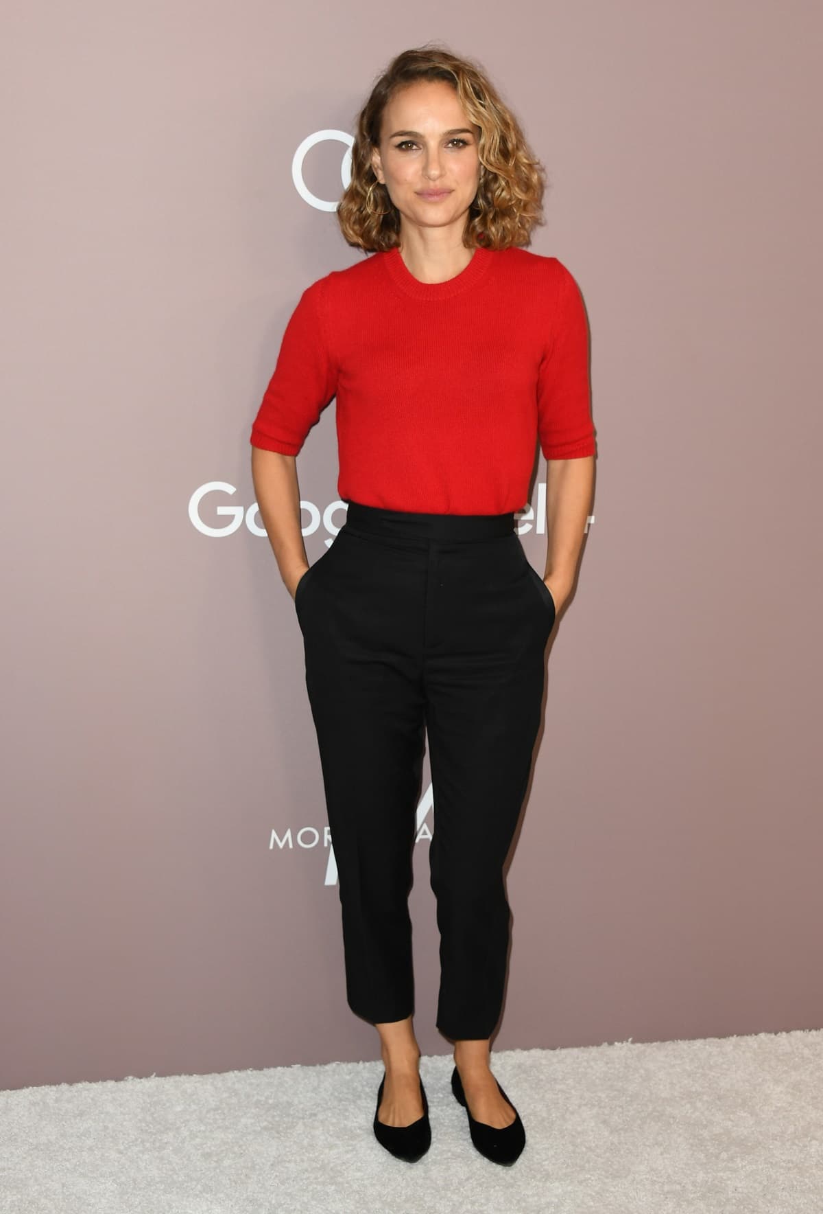 Alarga tu figura con un pequeño truco: usa zapatos puntiagudos. Estos crearán un juego visual al hacer más largos tus pies. Combínalos con unos pantalones del mismo color, como lo hizo Portman.