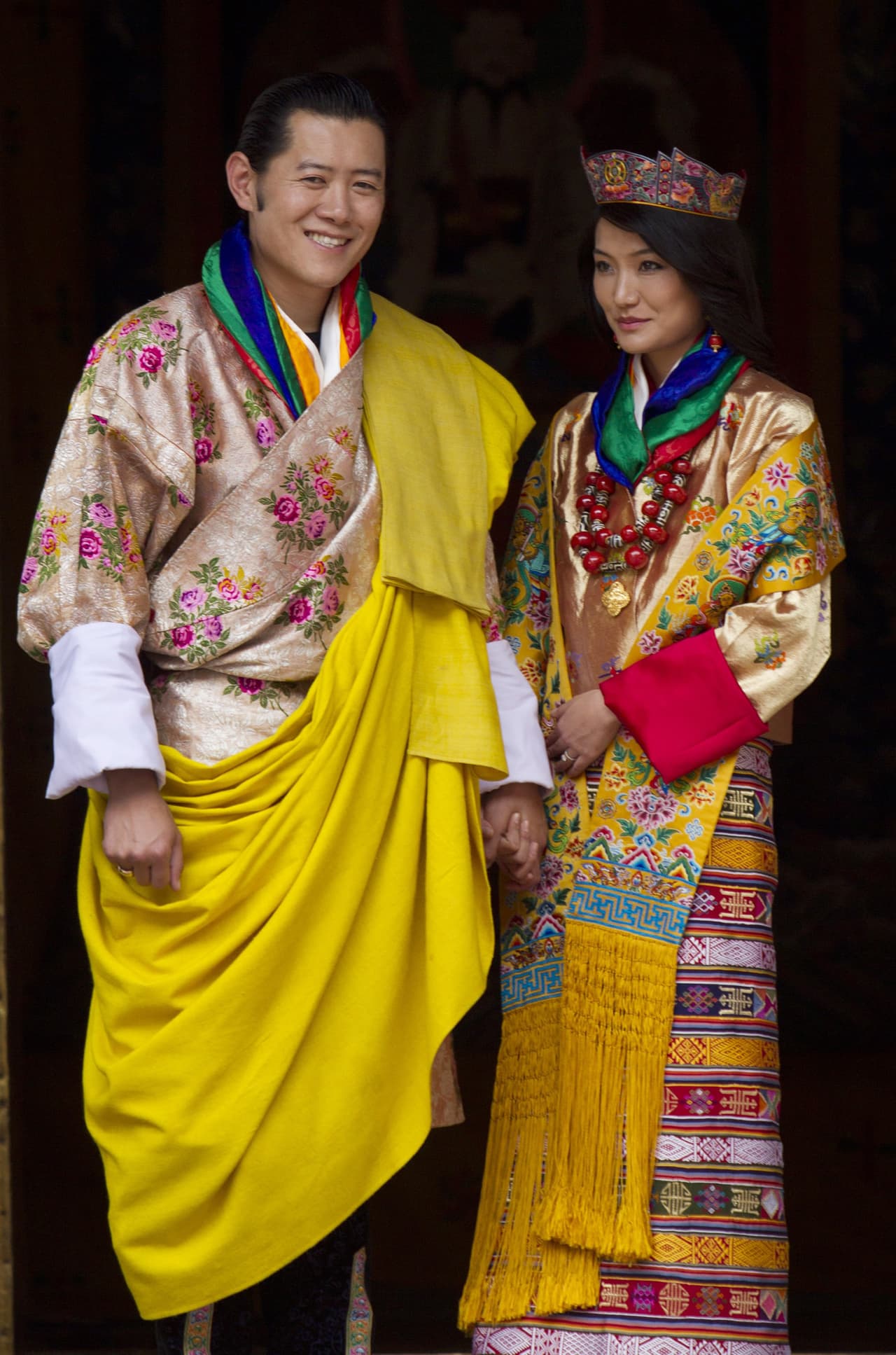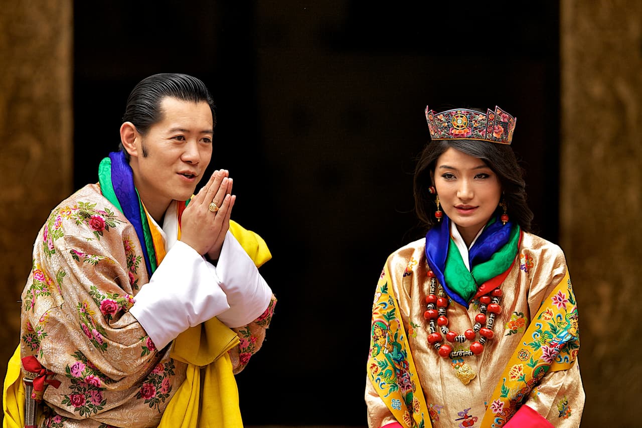 Para su boda con el príncipe Jigme Khesar Namgyel Wangchuc utilizó un atuendo tradicional en el budismo. Colores vivos y glandes pliegues le otorgaron el marco perfecto para el gran día.