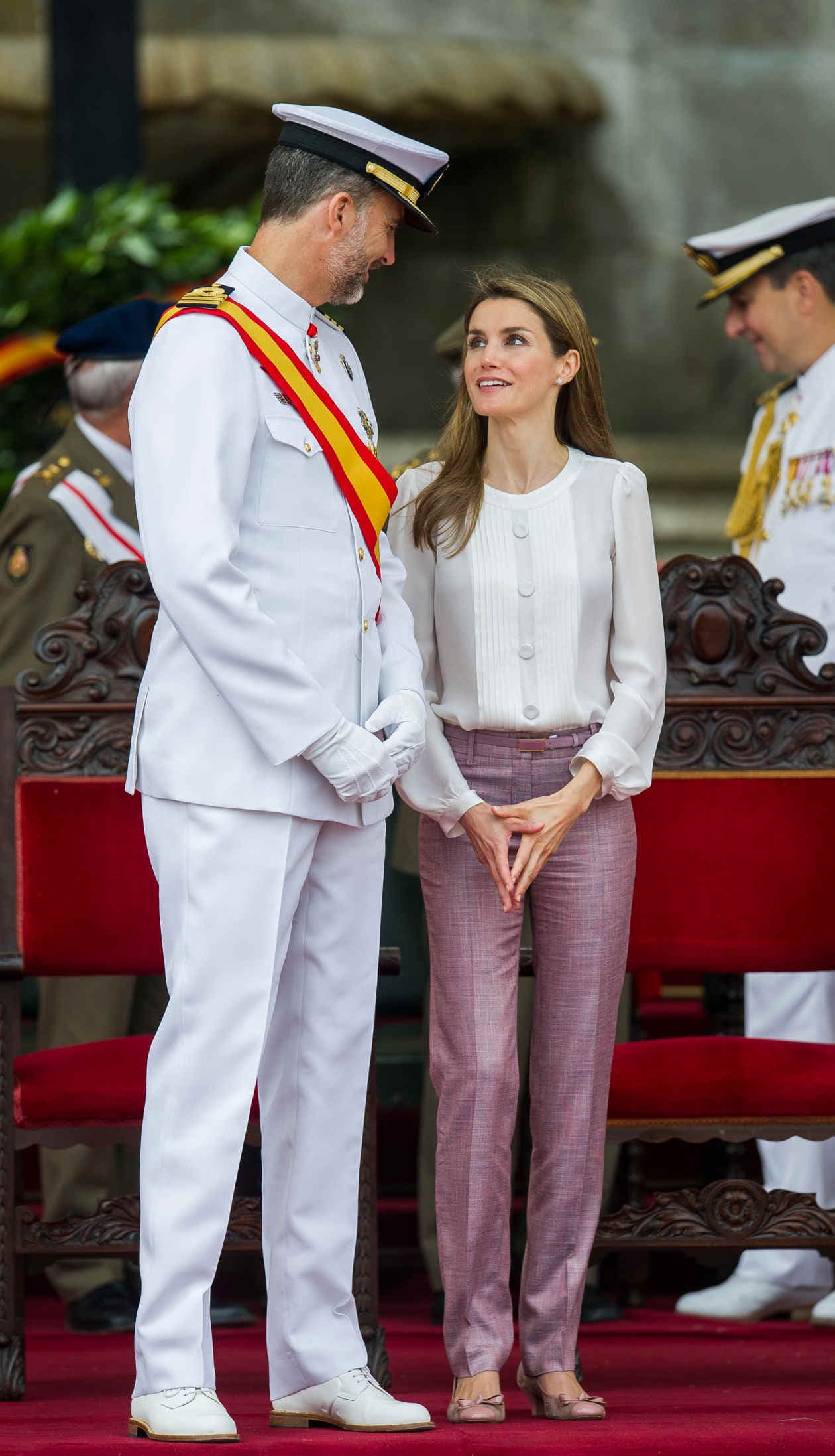 Cópiale el estilo a la Princesa Letizia de España, y no dudes en utilizar en tus reuniones un pantalón de vestir con corte sencillo pero un color o tela llamativa, y combinalo con una camisa de estilo romántico, preferentemente blanca o negra.