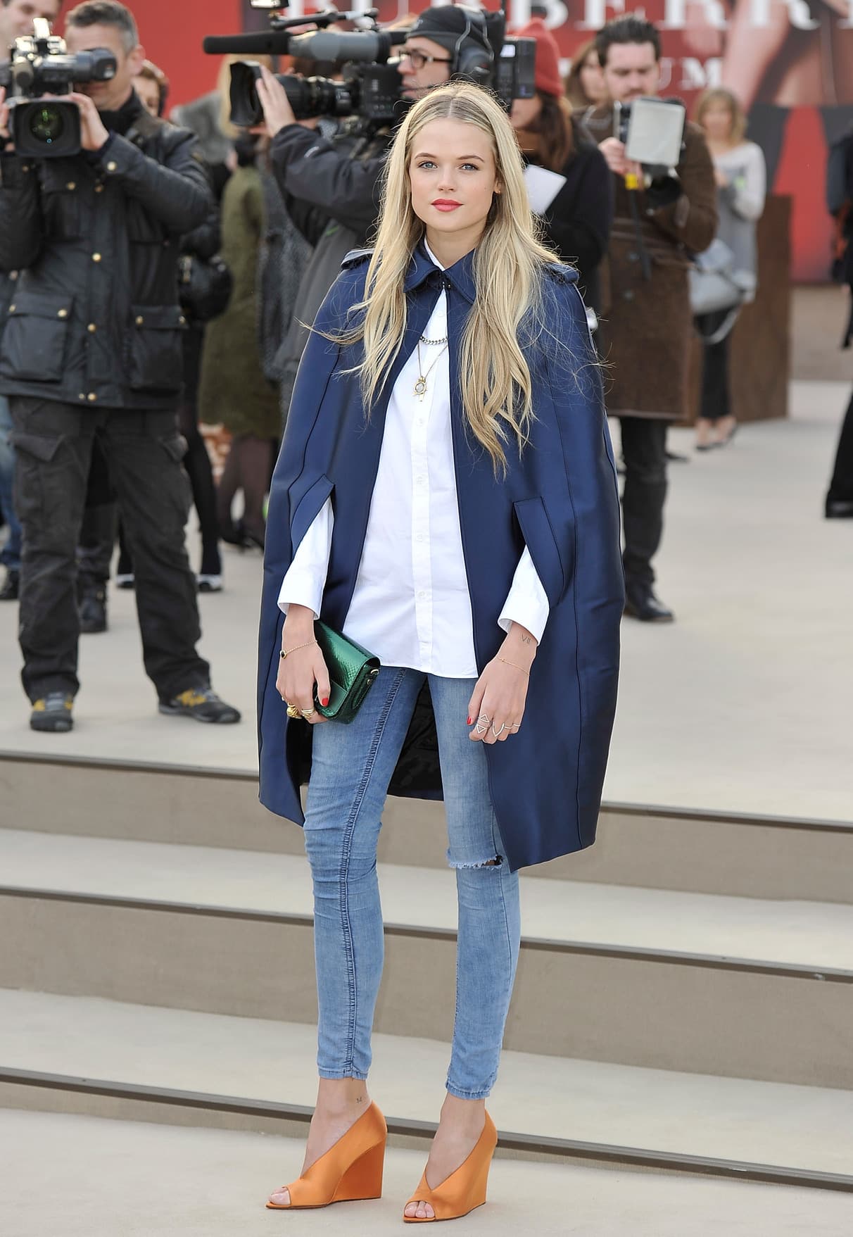 Tanto para el día como para la noche, si la sofisticación y la elegancia son tus objetivos, este outfit puede servirte como ejemplo. Unos skinny jeans apenas rotos, una camisa blanca larga, capa azul, clutch en verde y unas llamativas plataformas peep toe anaranjadas logran un look de lo más chic, ¿no te parece?