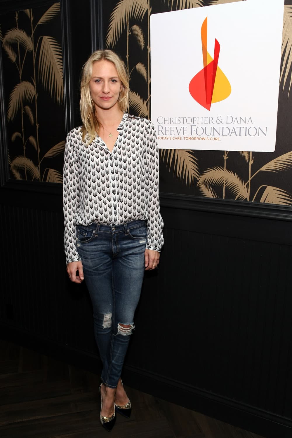 La modelo Miranda Kerr se ve bellísima y sofisticada con sus jeans rotos, a los que acompañó de musculosa y stilettos también en blanco, y un blazer color crema.
