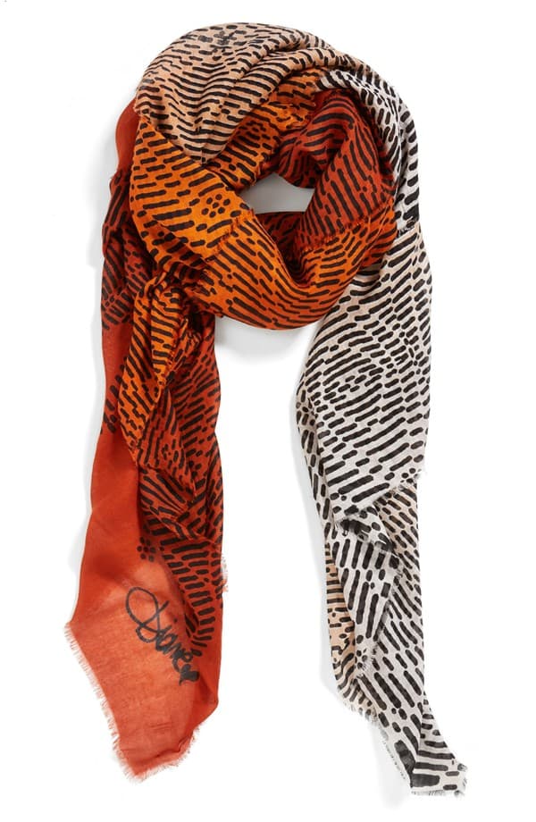 Una gran opción para elegir un pañuelo para completar tu look es elegir un pañuelo en diferentes tonos, ya que te permitirá combinar con más prendas que un solo color. Este pañuelo de Diane Von Furstenberg es divertido y original en tres tonos o en degradé de naranja fuerte a amarillo.
