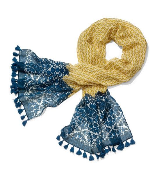 Los diseños de pañuelos con flecos le dan un toque diferente y de movimiento a este gran accesorio. Puedes elegir un pañuelo en dos tonos como este de Tory Burch que además combina diferentes estampados. Perfecto para llevar a la oficina.