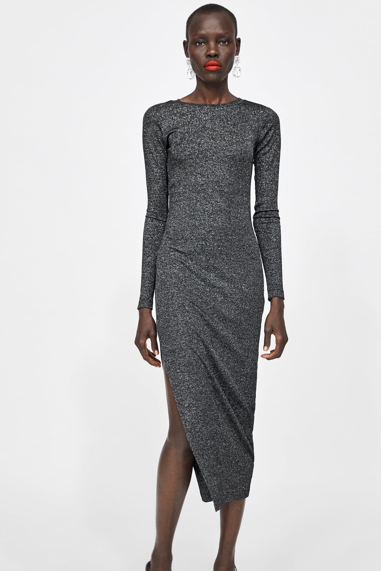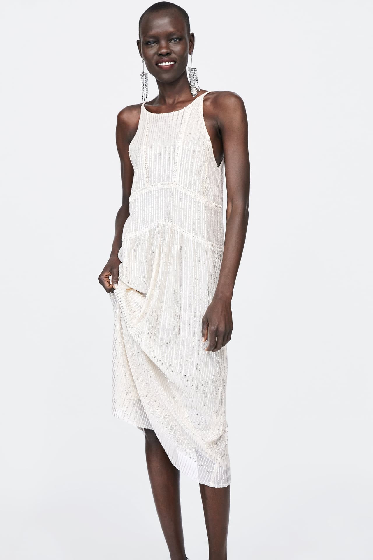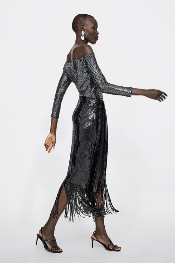 Si todas las lentejuelas que hemos visto no son suficientes para ti, aquí tenemos otro vestido de Zara donde no escatimaron con el brillo. Es perfecto para chicas súper extrovertidas.