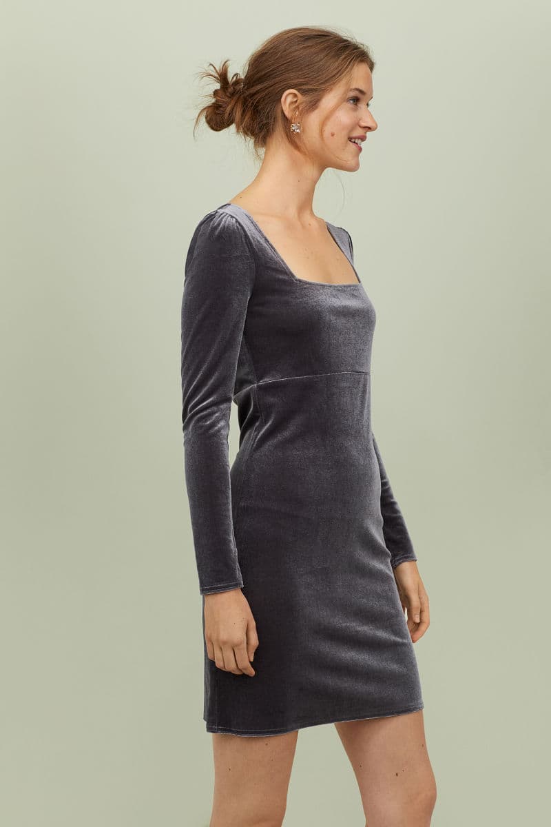 El terciopelo gris es una maravillosa opción para un evento formal, pero también puedes darle un toque más casual dependiendo de tu peinado. ¿Qué opinas de esta opción de H&M?