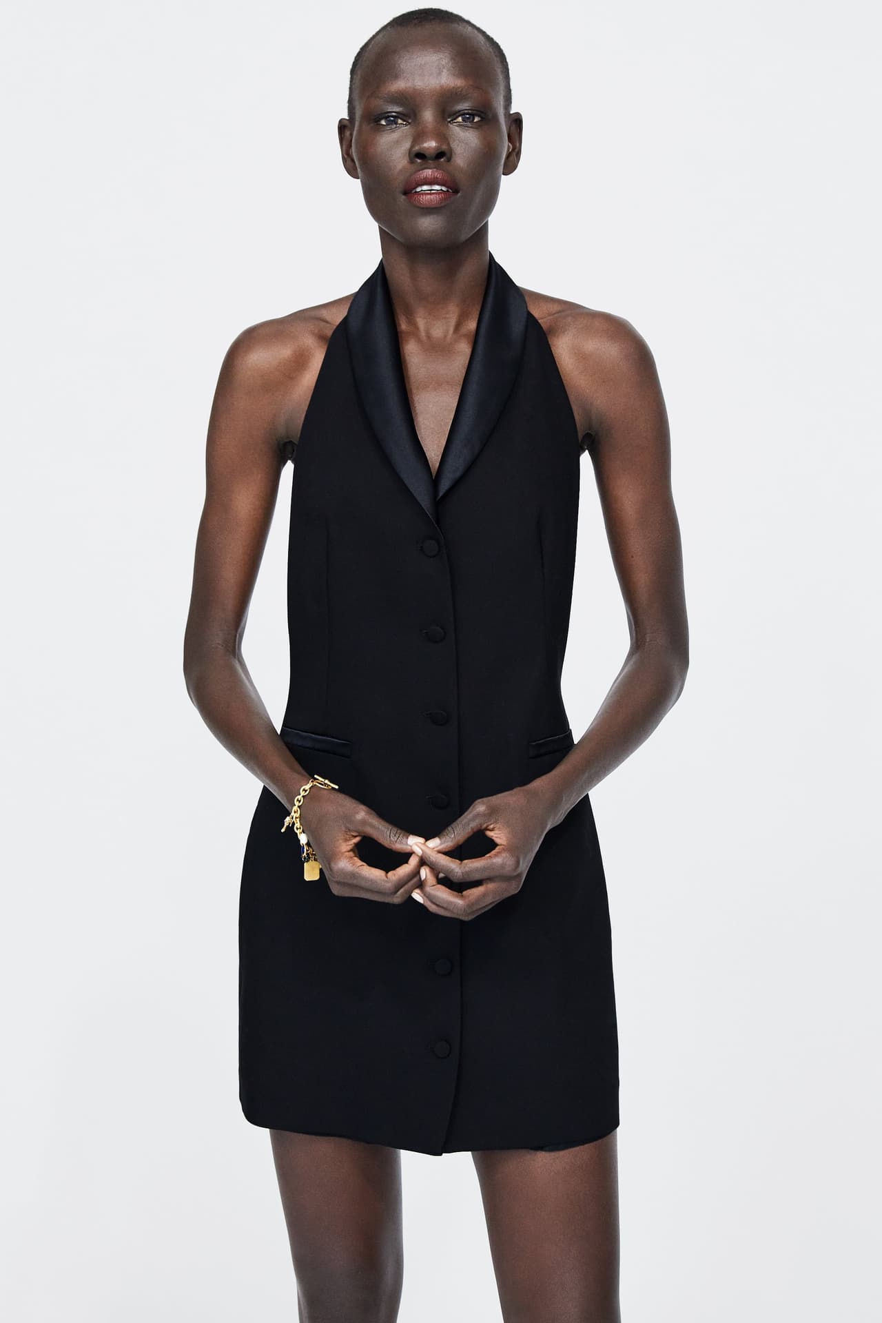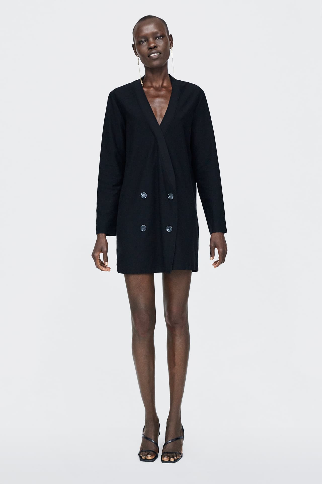 Un tendencia que por estos días está triunfando. son los vestidos que simulan el corte de un saco. Este modelo es sexy, elegante y brillante. Lo encuentras en Zara.