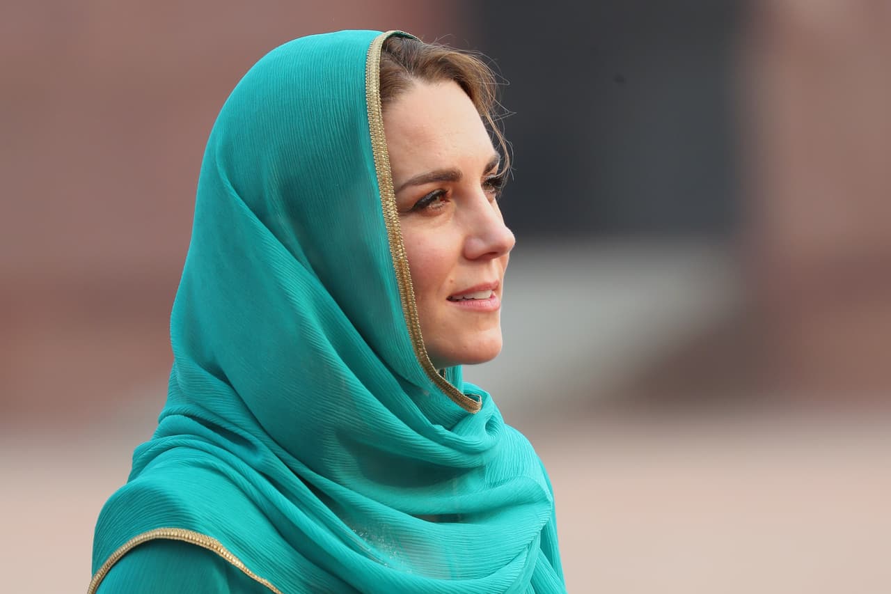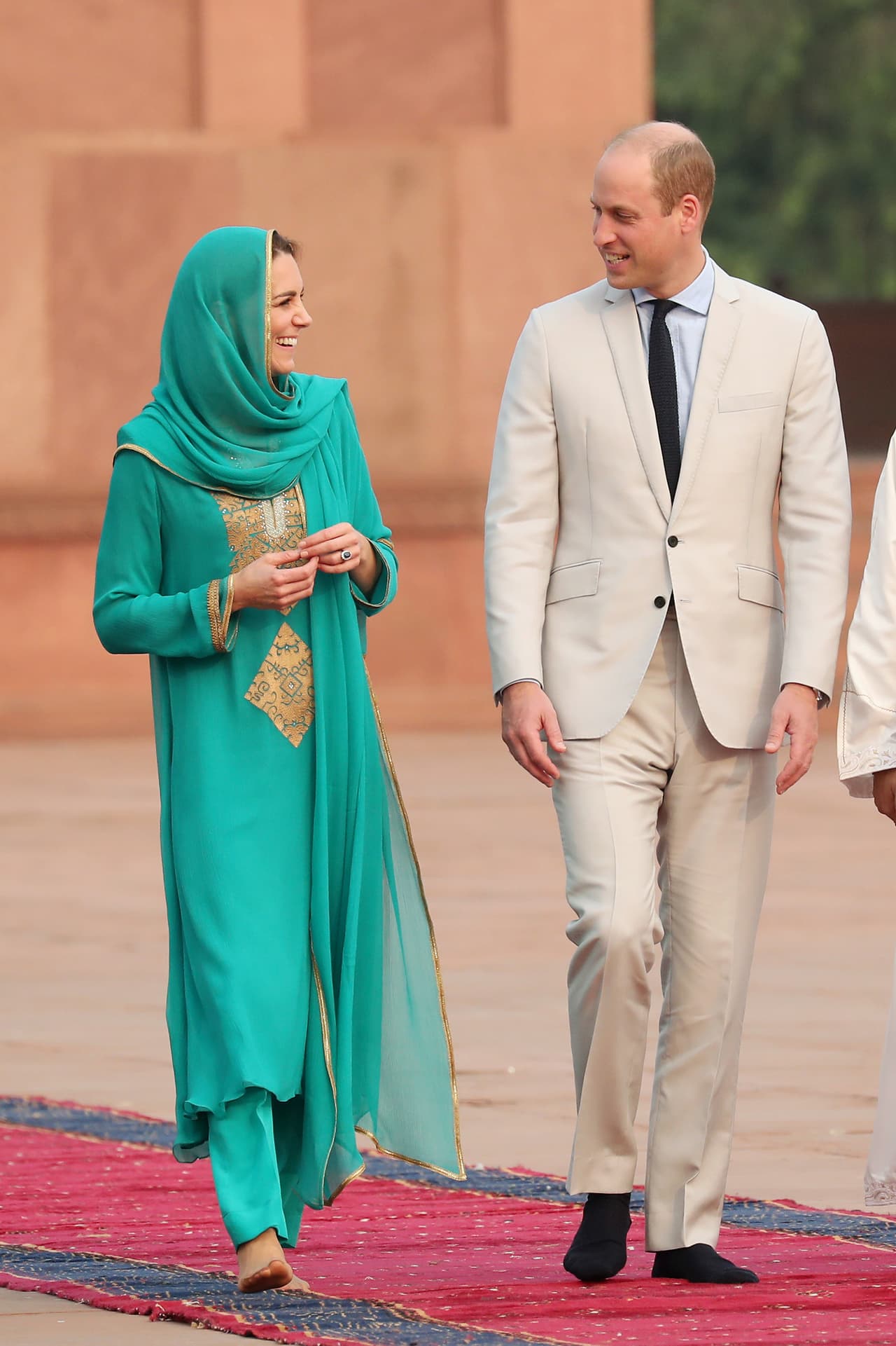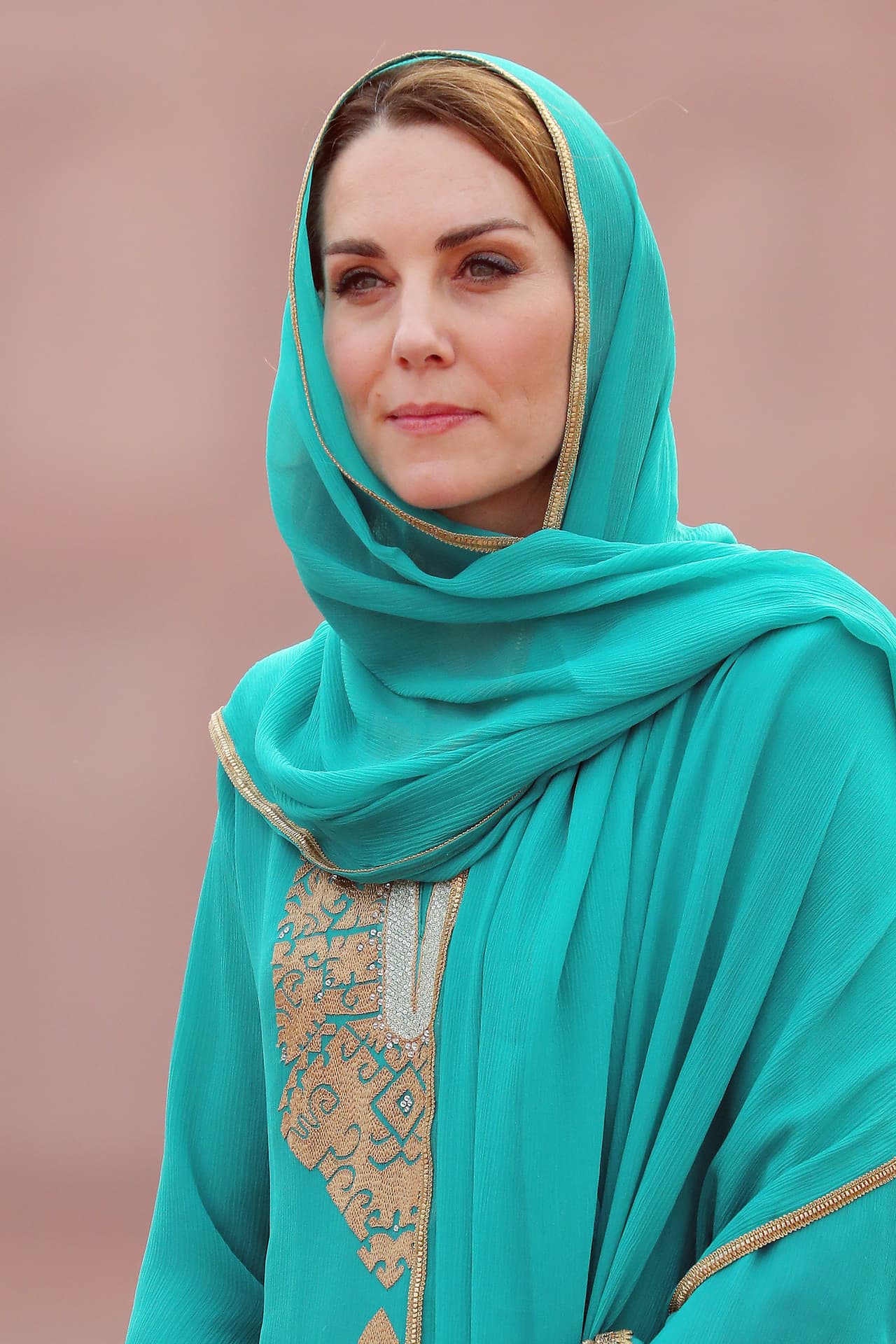 La duquesa asistió a la mezquita Badshahi en Lahore (lugar sagrado en que no se puede entrar en zapatos), vestida con una delicada túnica color turquesa. La pieza la combinó con unos pantalones a juego y un velo, que se encontraba decorada con una orilla dorada.