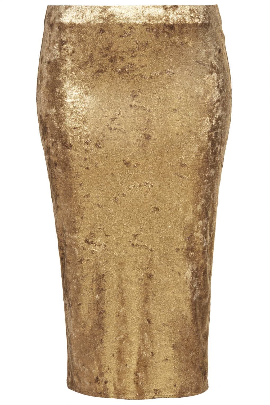 Esta increíble falda de terciopelo dorada de Topshop es una excelente opción para un evento nocturno.