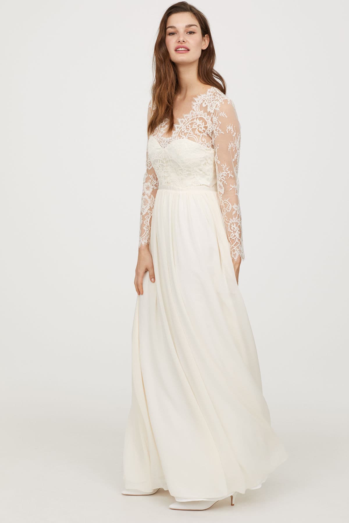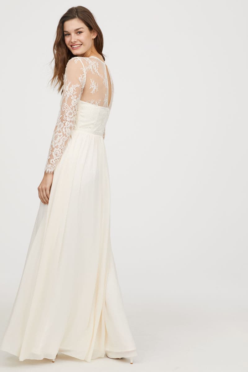 El color, la silueta, el escote transparente en V sobre el corpiño en forma de corazón y las mangas de encaje. A excepción de algunos detalles del encaje, la abertura en la espalda y la clásica cola de vestido de novia, la prenda de H&M tiene una esencia muy similar al de Kate. El modelo se llama Long Lace Dress y sólo puede comprarse en línea ( aquí te compartimos el link, ya sabes, por si necesitas verlo para una tarea).