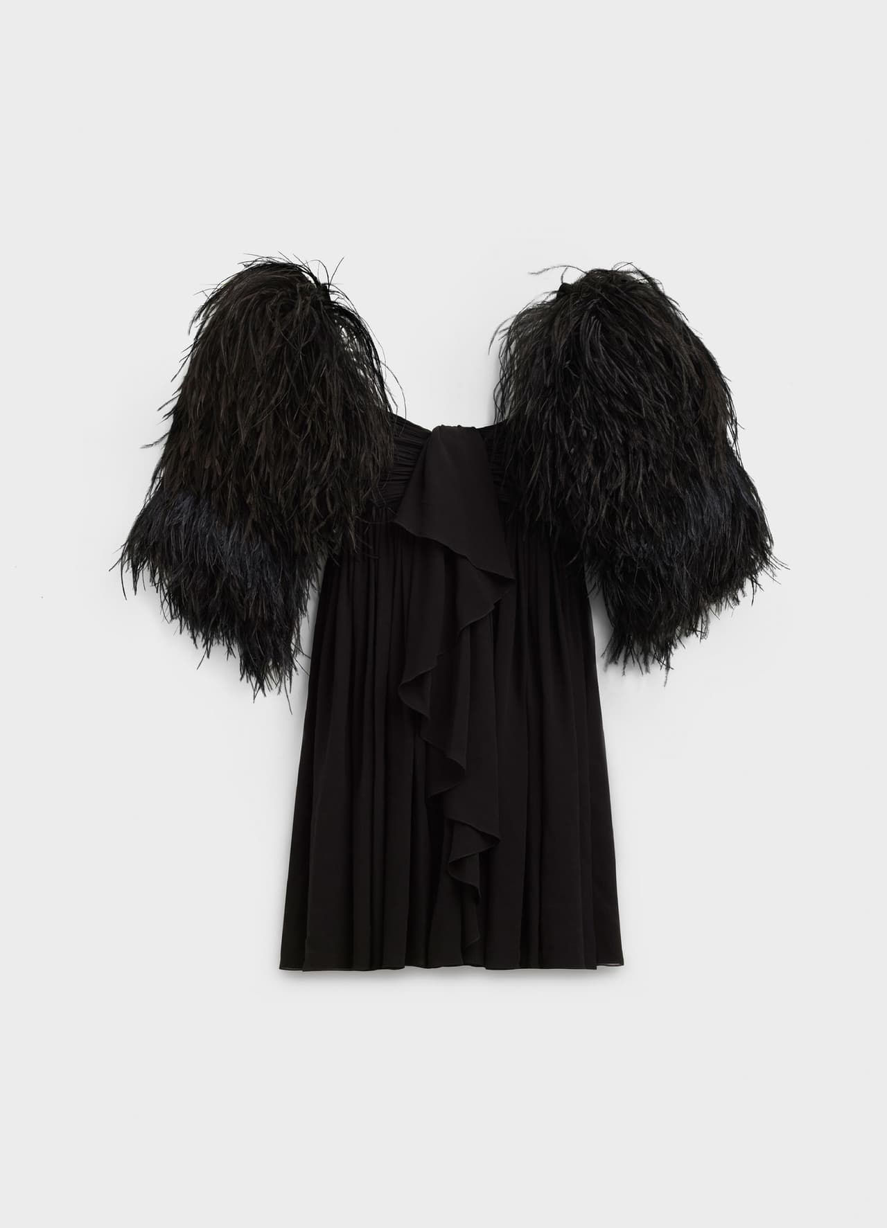 Para el estreno de la película The Dead Don't Die, Selena escogió un vestido negro por encima de la rodilla: un largo que se le ve bien tanto a las personas altas como bajitas. El elemento más llamativo fueron las abultadas mangas cubiertas con plumas de avestruz.