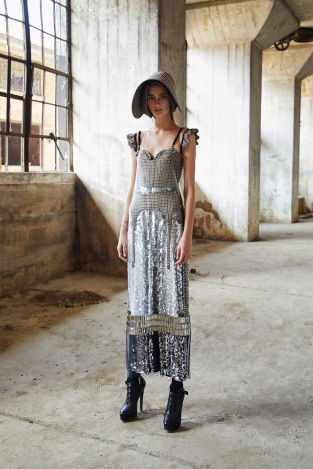 El vestido, de la diseñadora norteamericana Vera Wang, se compone de una parte superior en tela a cuadros, con el detalle de un par de tiradores que caracteriza a varias otras prendas de esta marca. Unas tiras con volados dan el toque en los hombros. La parte inferior del vestido es muy diferente: una falda con lentejuelas plateadas y, hacia el final del vestido, un borde con lentejuelas negras. La tenista y campeona del Grand Slam combinó el vestido con unos aretes de diamantes, igual de luminosos. En los pies llevó unos tacones plateados con tachas.