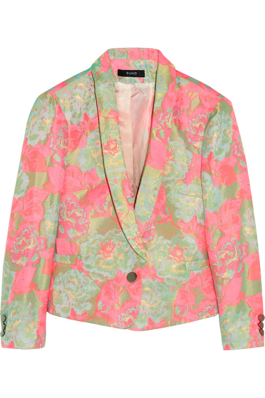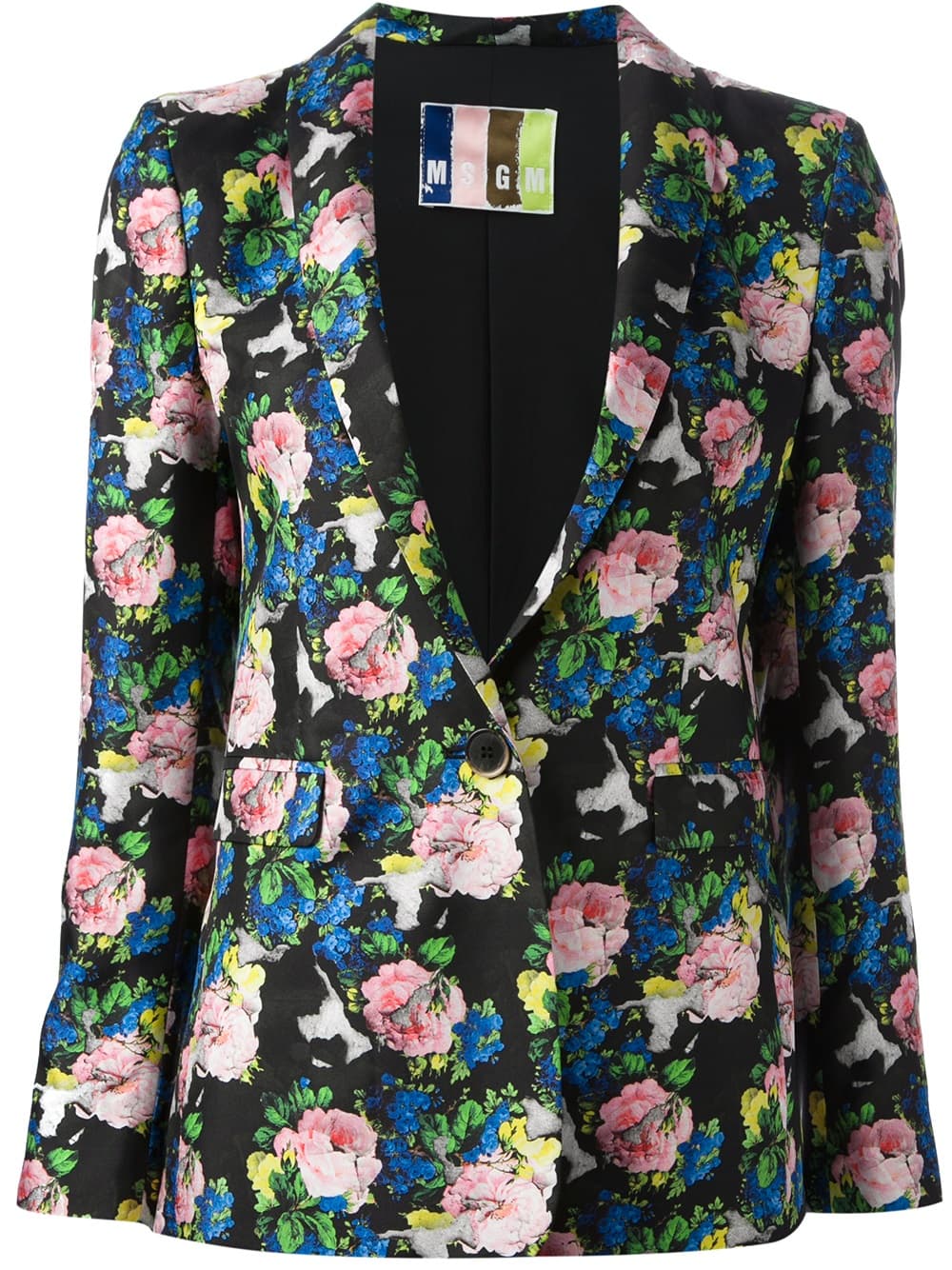 Las flores en tonos rosa sobre un blazer negro lucen llamativas, ideales para incorporar a tu look de noche. Incluso hasta puedes combinarlo con un short de tiro alto de jean o de color negro.