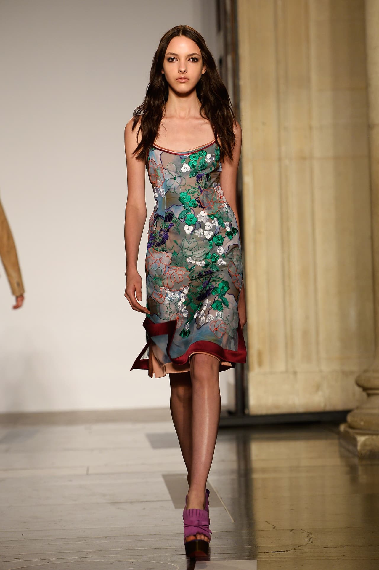 En este 2014, se usarán los estampados con flores de estilo romántico, mucho color y también mucho bordado y apliques de flores con textura como vemos en el vestido de la modelo, desfilando para Jonathan Saunders en la Semana de la moda de Londres.