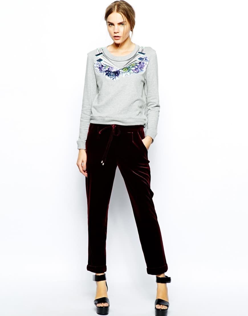 El bordó es un gran color para lucir un pantalón de terciopelo como este de Emma Cook.
