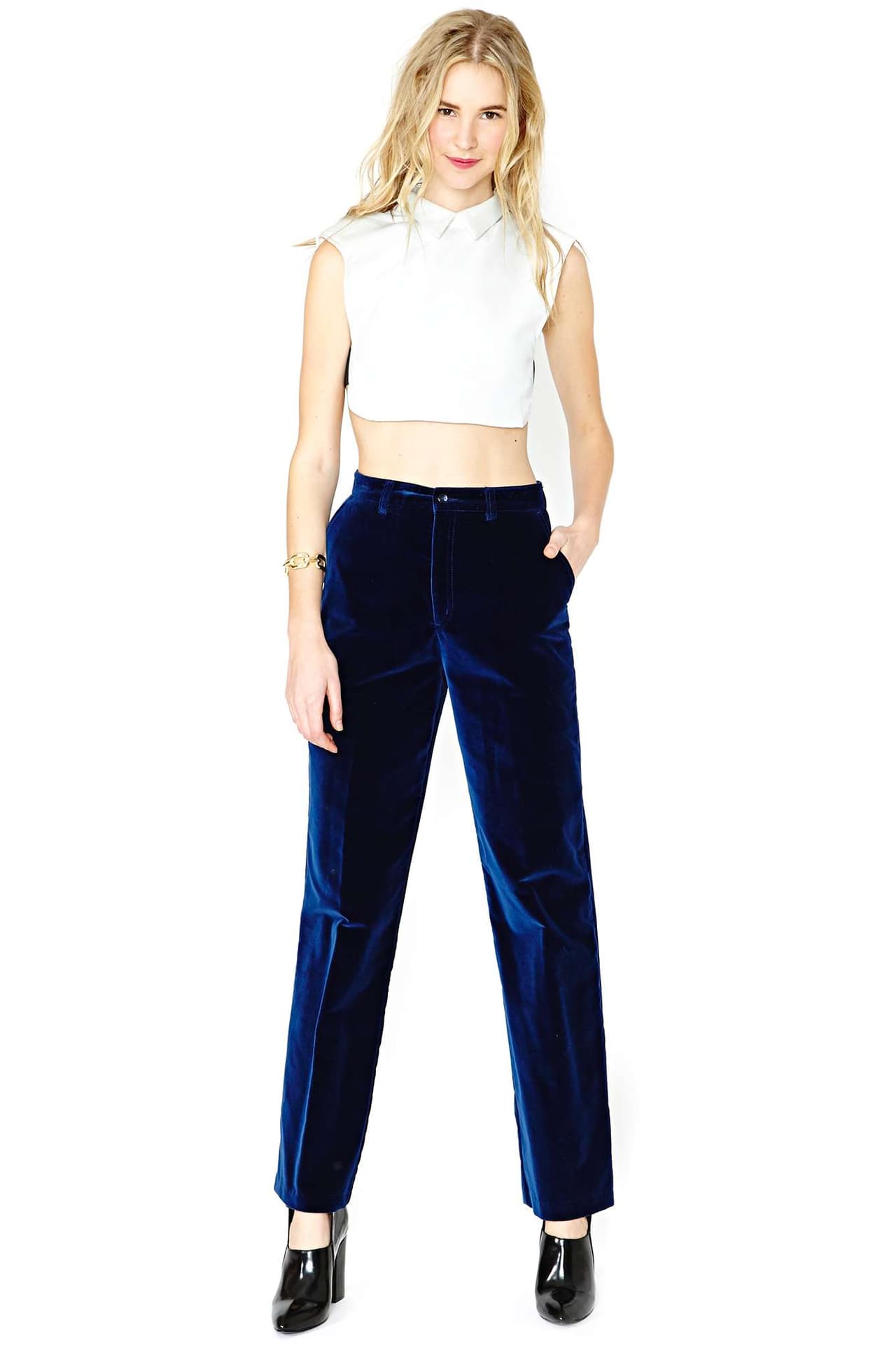 Otro color intenso y llamativo es el azul, que luce muy bien en una textura de terciopelo. Puedes combinar un pantalón como este de Diane Von Furstenberg con colores neutros como blanco, negro o gris.