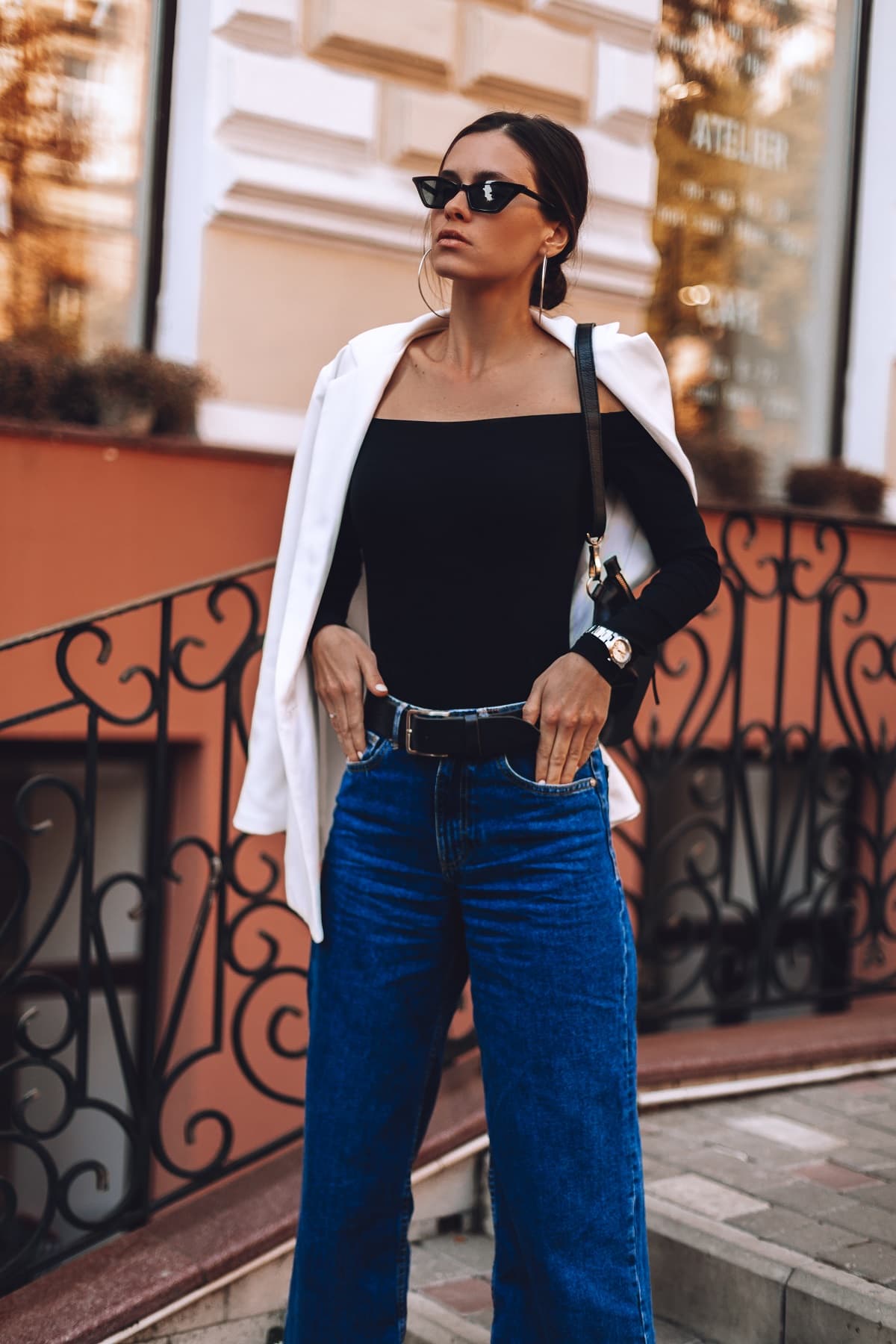 En épocas de otoño el viento comienza a hacer estragos en el clima, pero evita que eso afecte tu outfit. Puedes agregar una blusa a los hombros color negra, combinada con una americana blanca.
